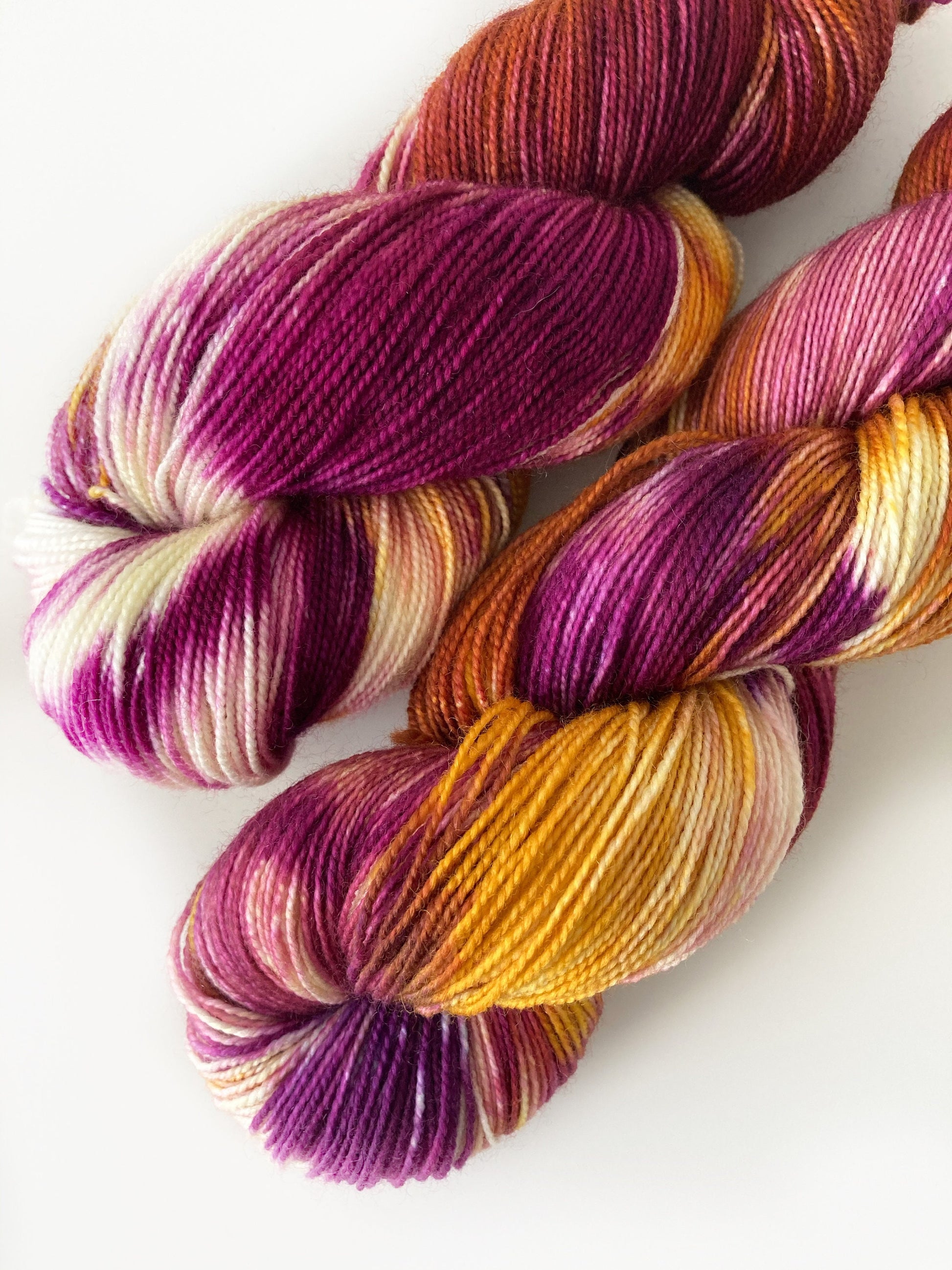 I hand-dye all my yarn in small batches, so variations from skein to skein are normal. While this skein has been rinsed thoroughly, I recommend you wash the finished project from this hand dyed yarn separately the first time. Even though the yarn is a Super Wash I feel it is a better choice to hand wash hand dyed yarns. All my yarn is dyed in a smoke free environment.