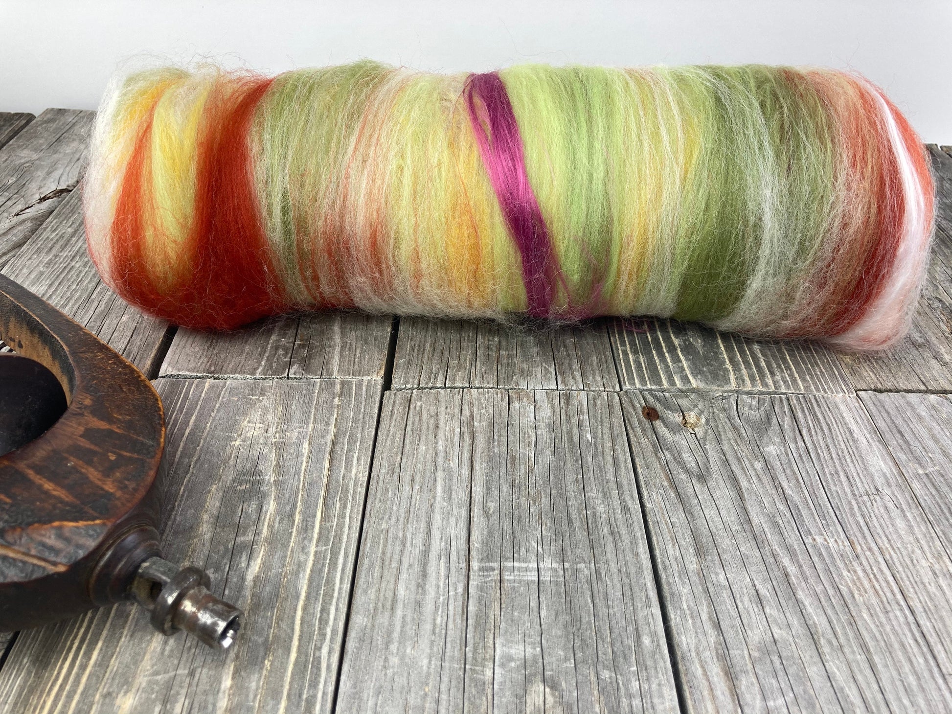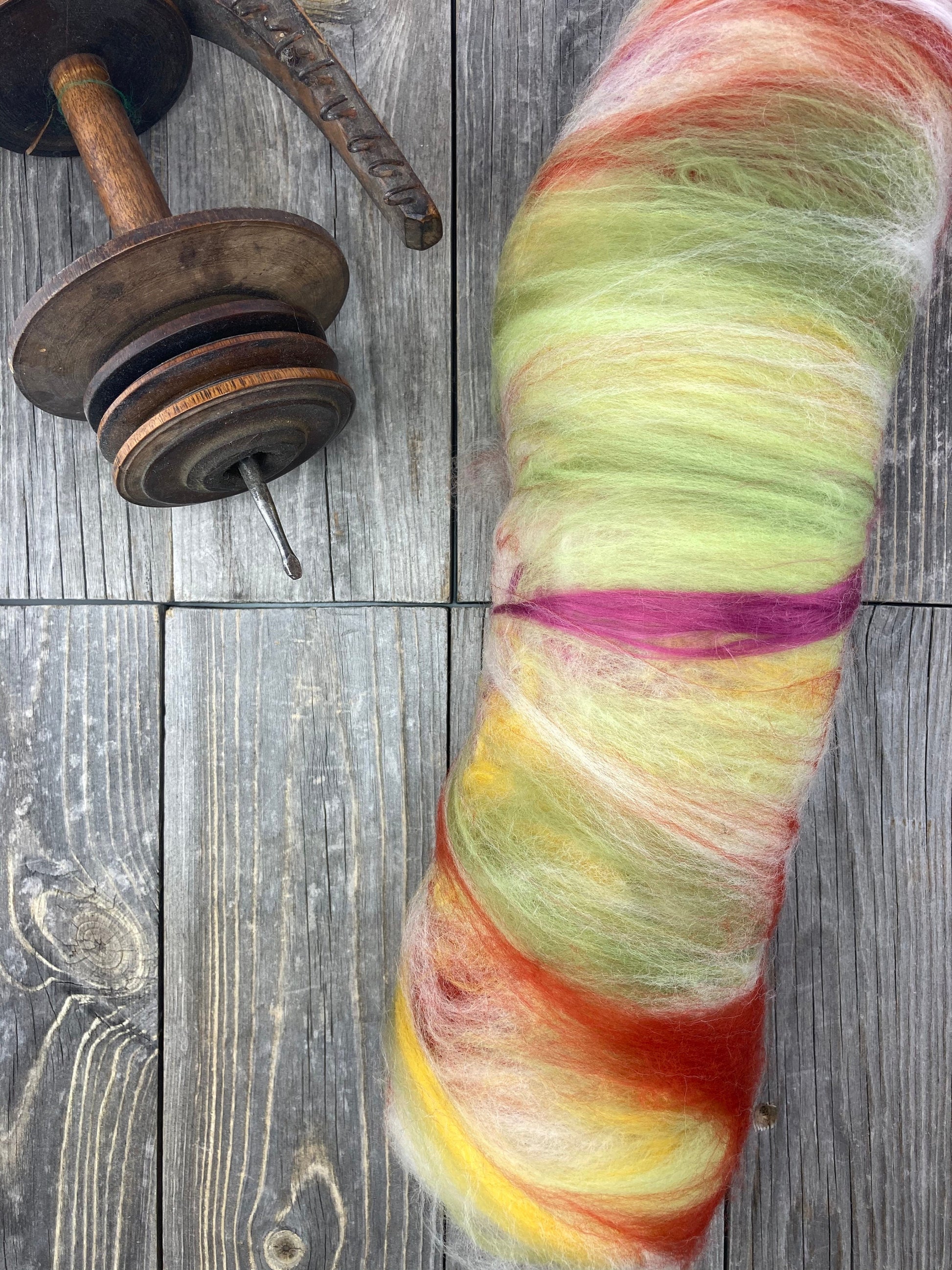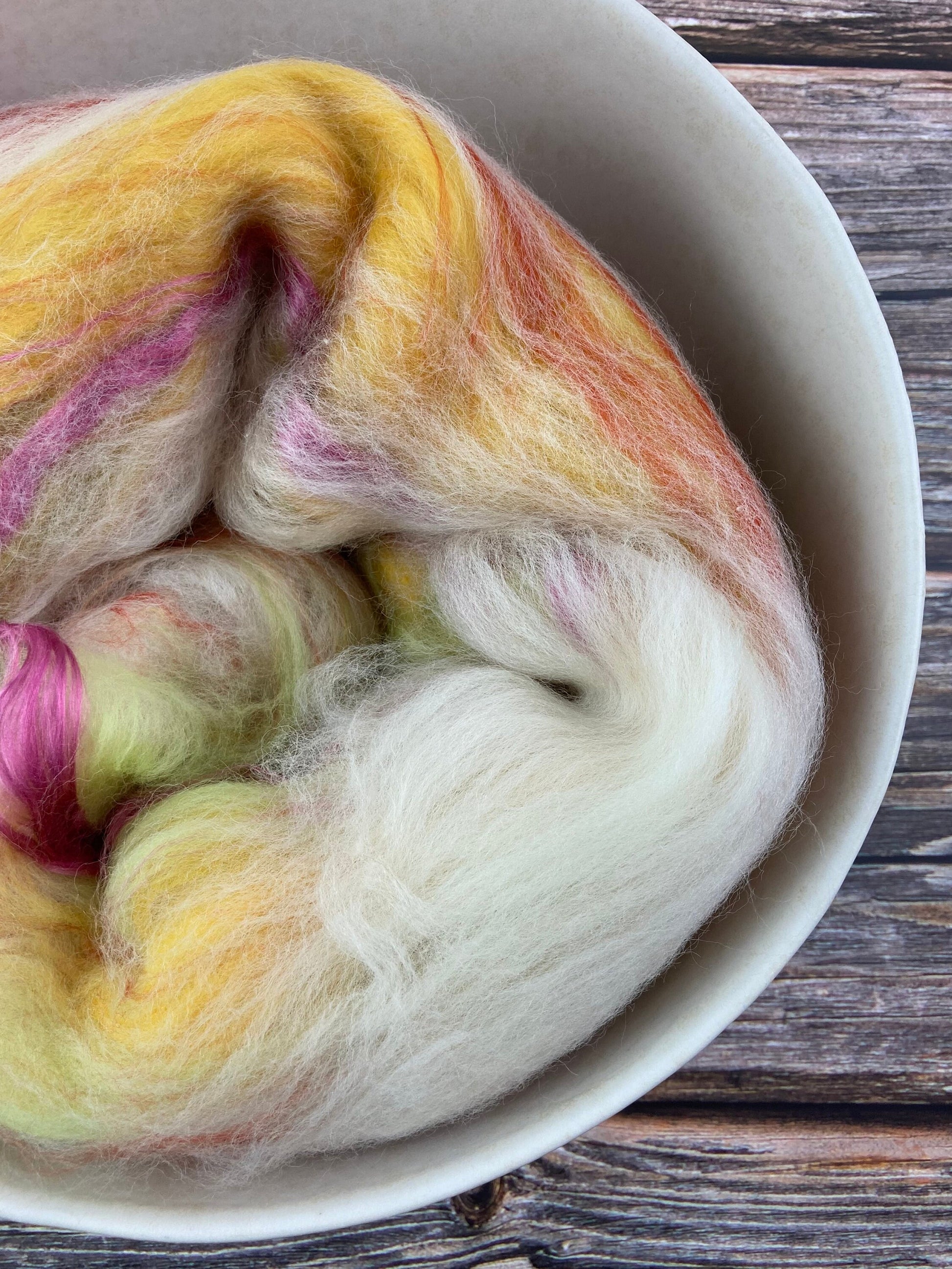 Smooth and luxurious blended art batt from assorted naturally dyed Merino, BFL, Tencel and Silk.