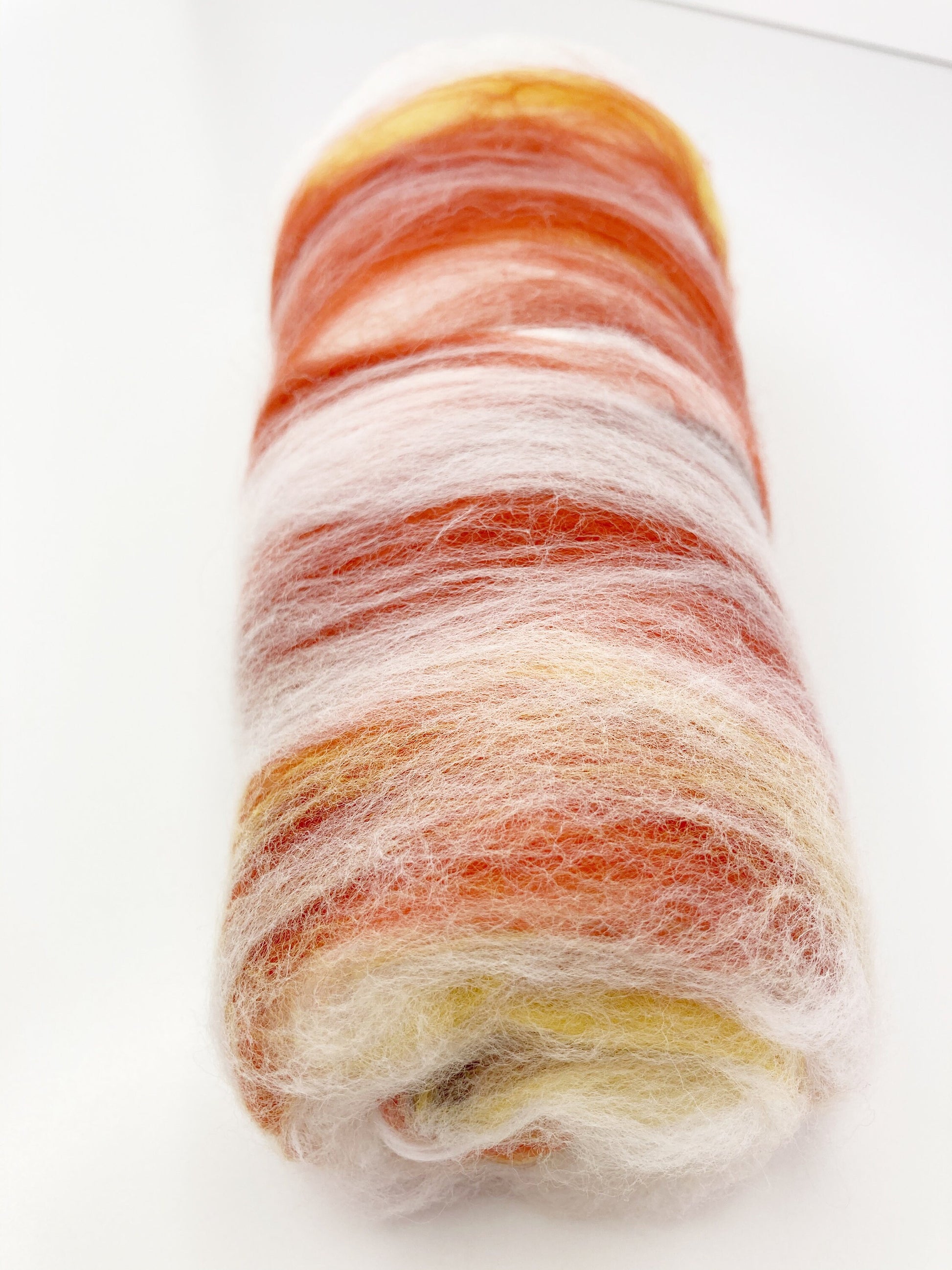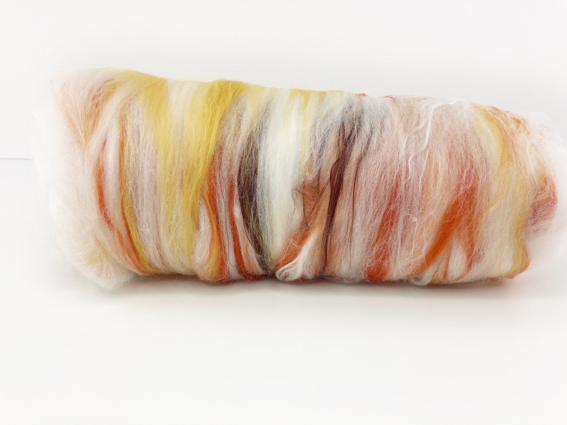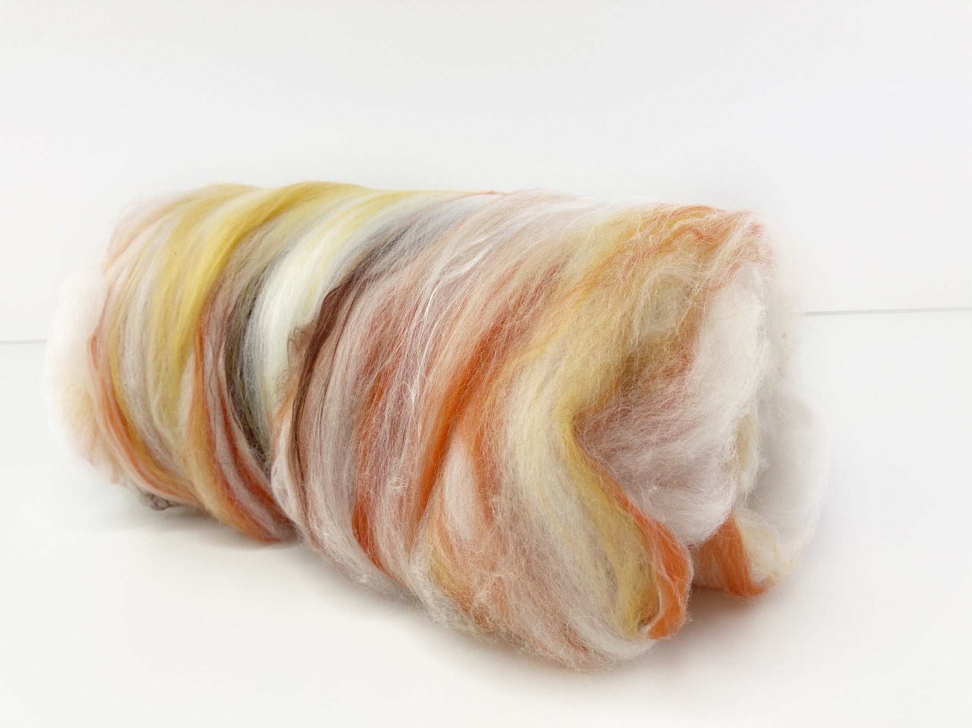 Smooth and luxurious blended art batt from assorted naturally dyed Merino, which is ethically sourced from non mulled sheep from Australia and South America, Silk and Tencel.