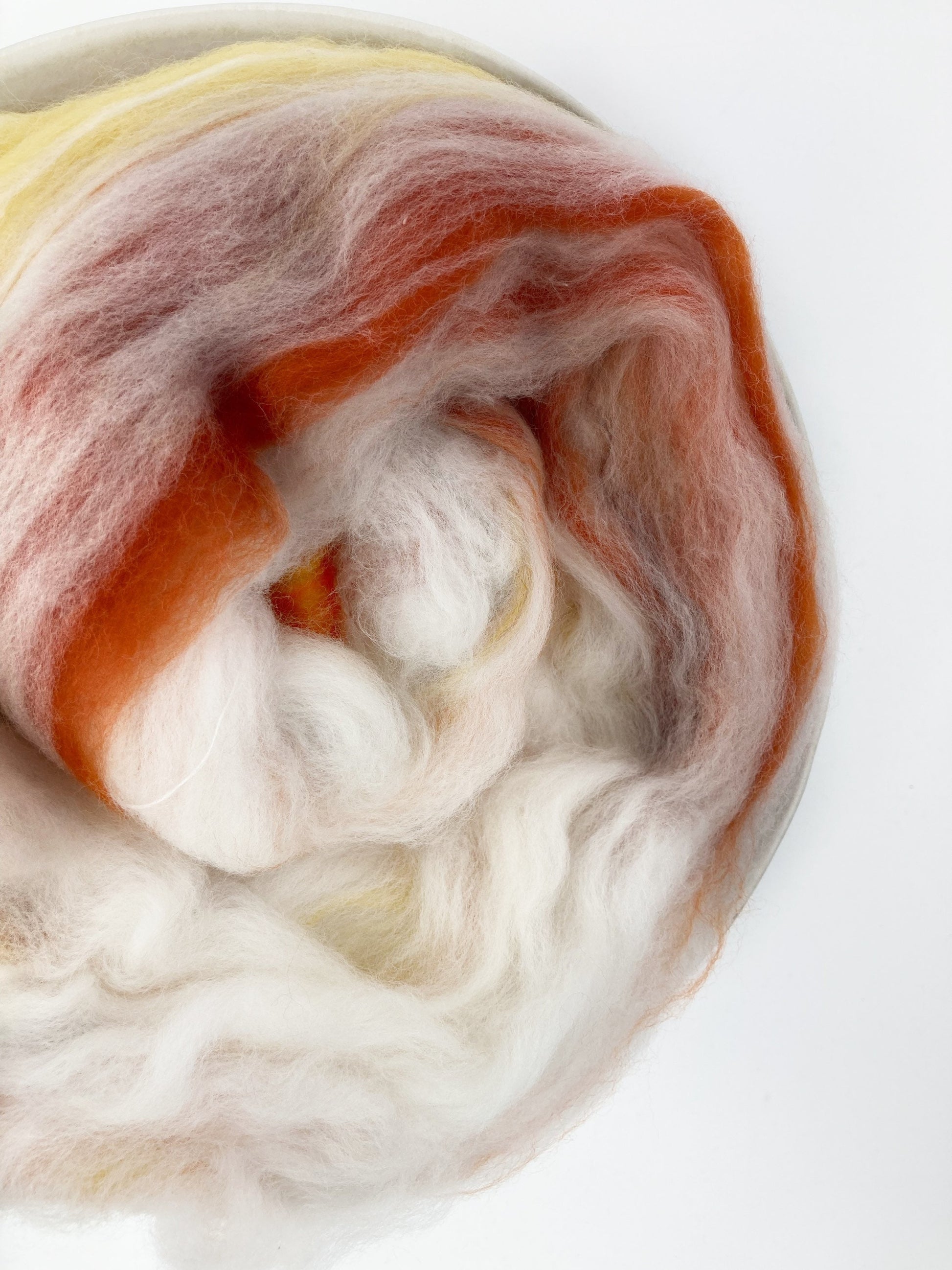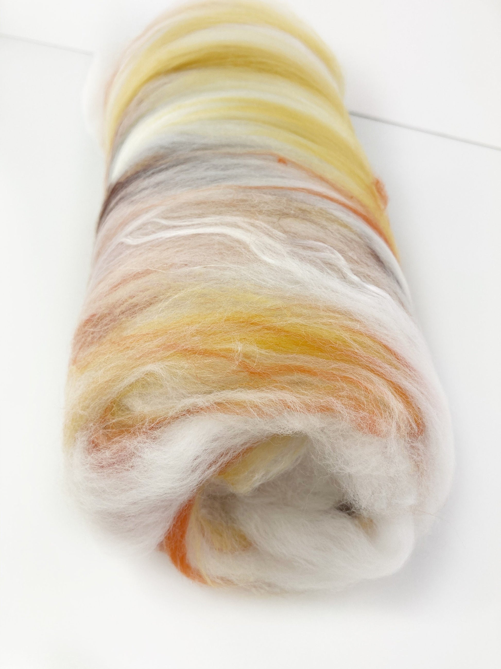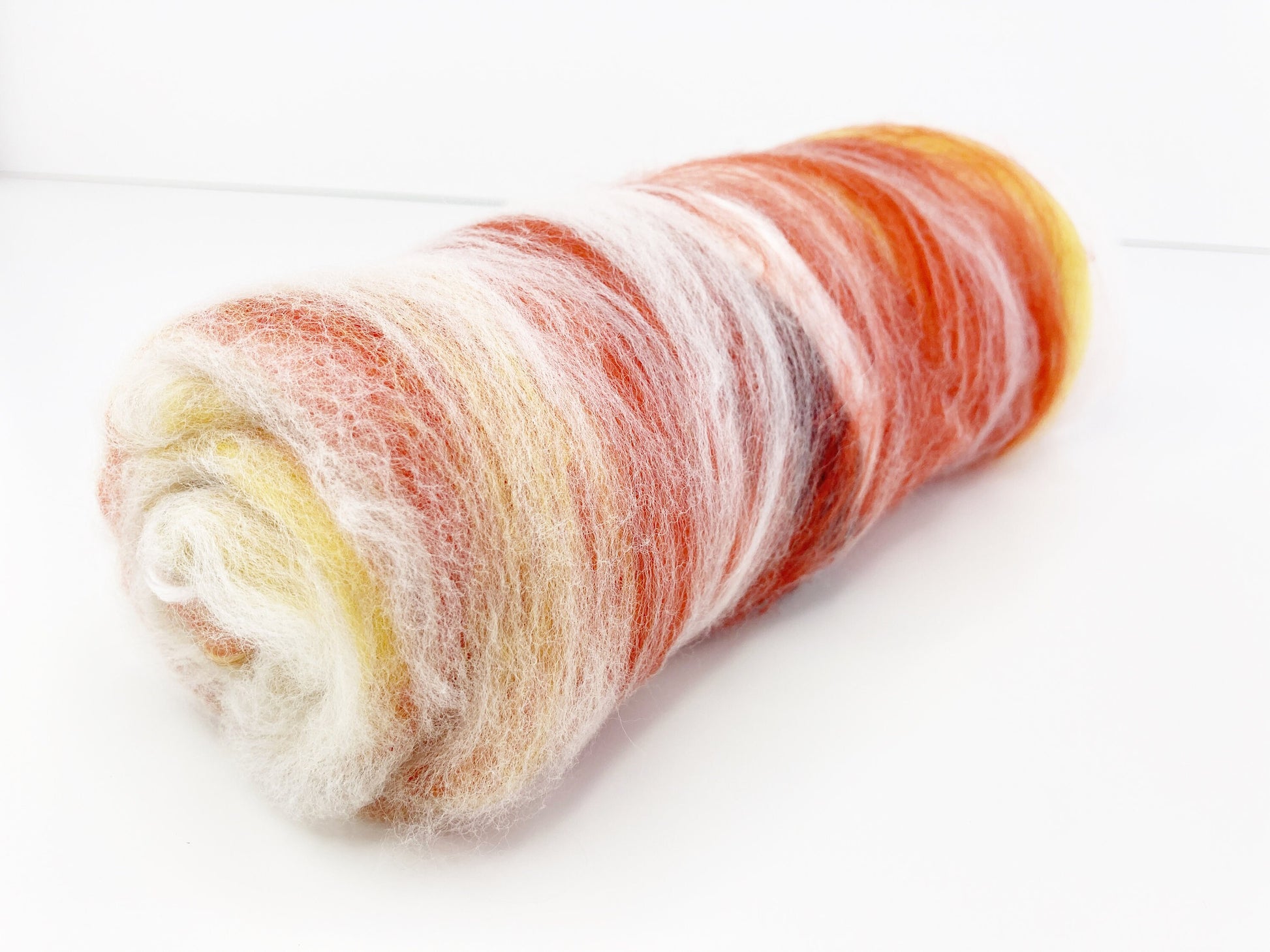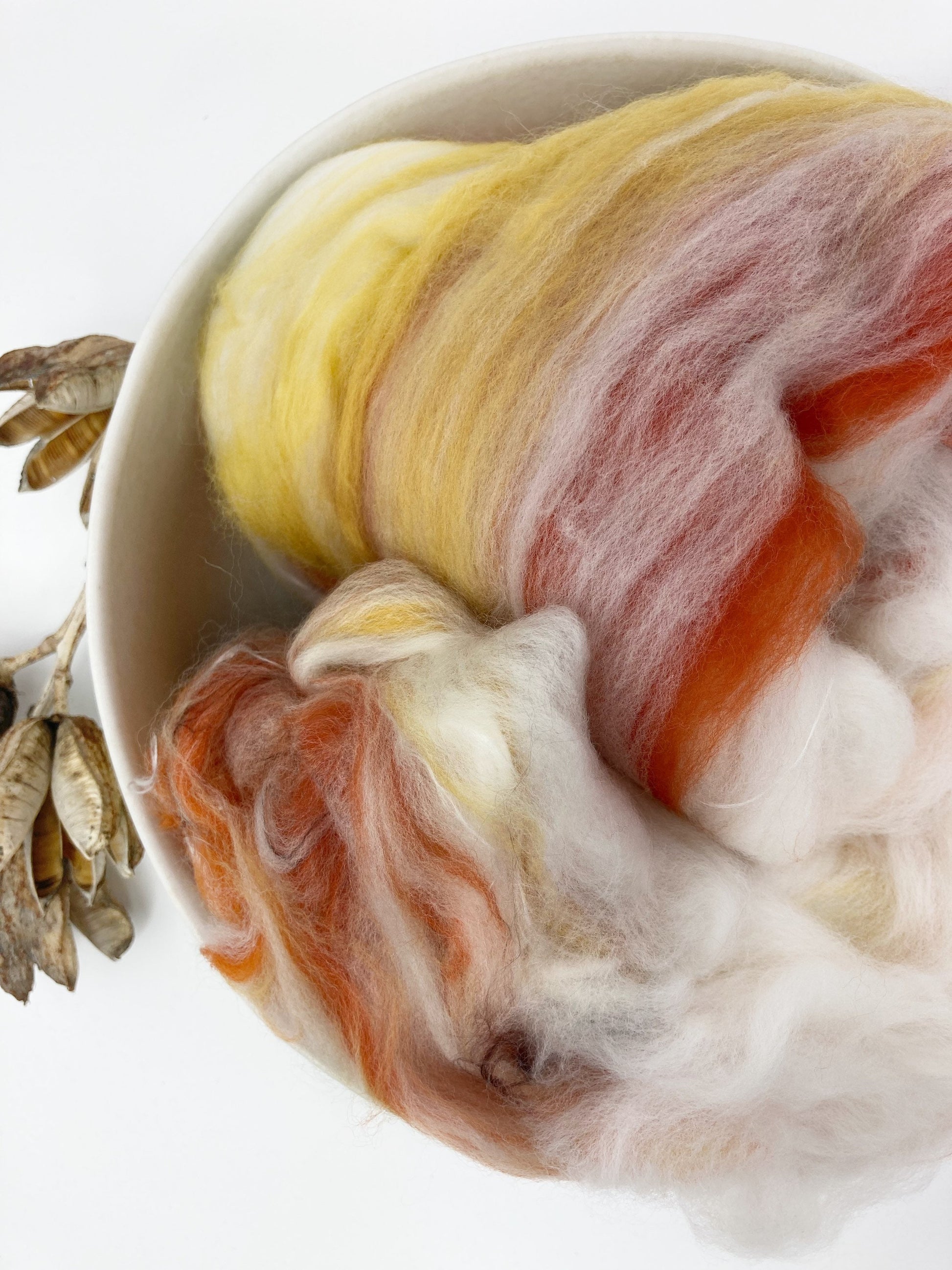 Smooth and luxurious blended art batt from assorted naturally dyed Merino, which is ethically sourced from non mulled sheep from Australia and South America, Silk and Tencel.