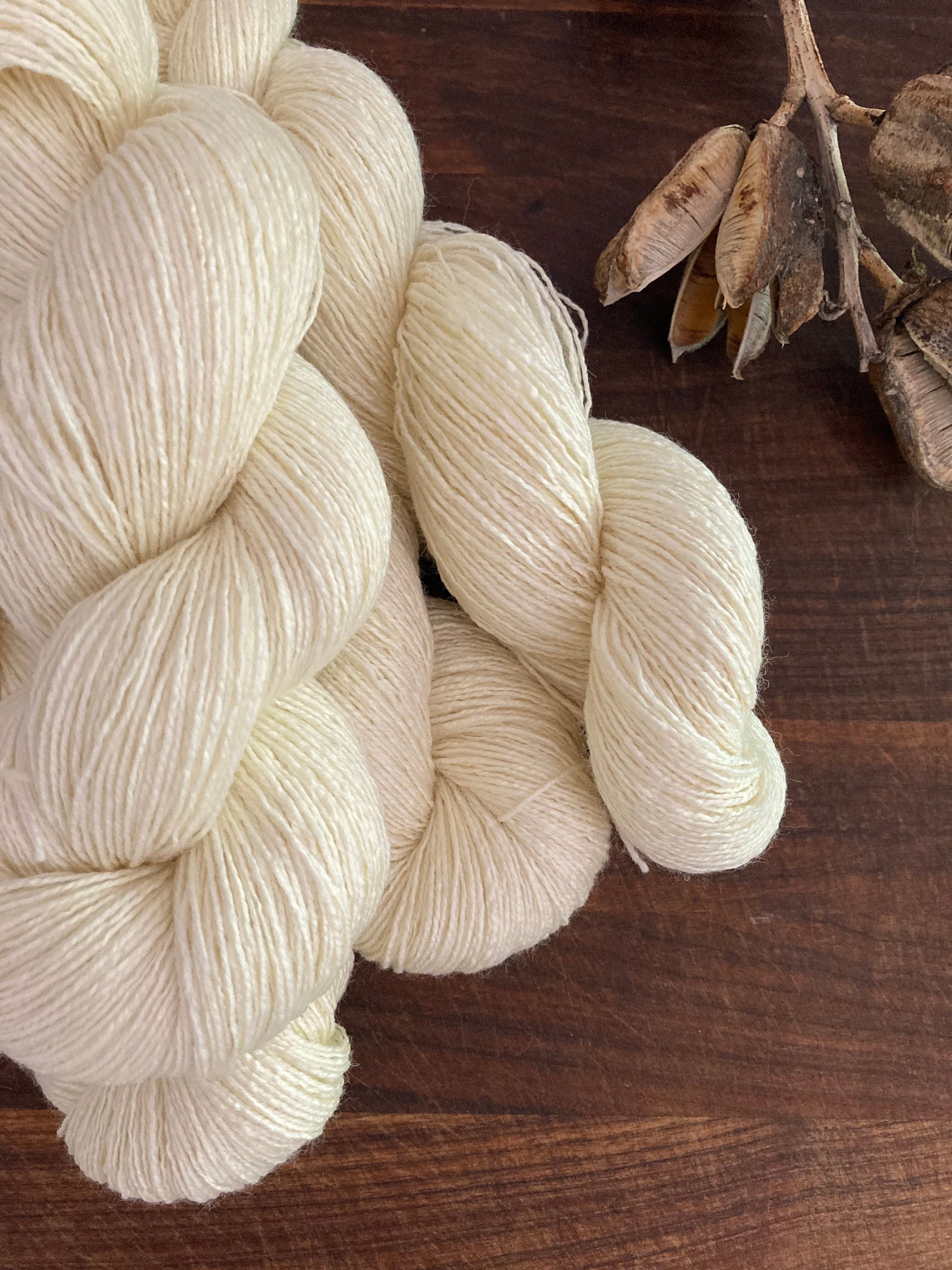 Undyed Super soft and washable Merino yarn, two ply. Very soft and easy to knit yarn. Takes up color beautifully.