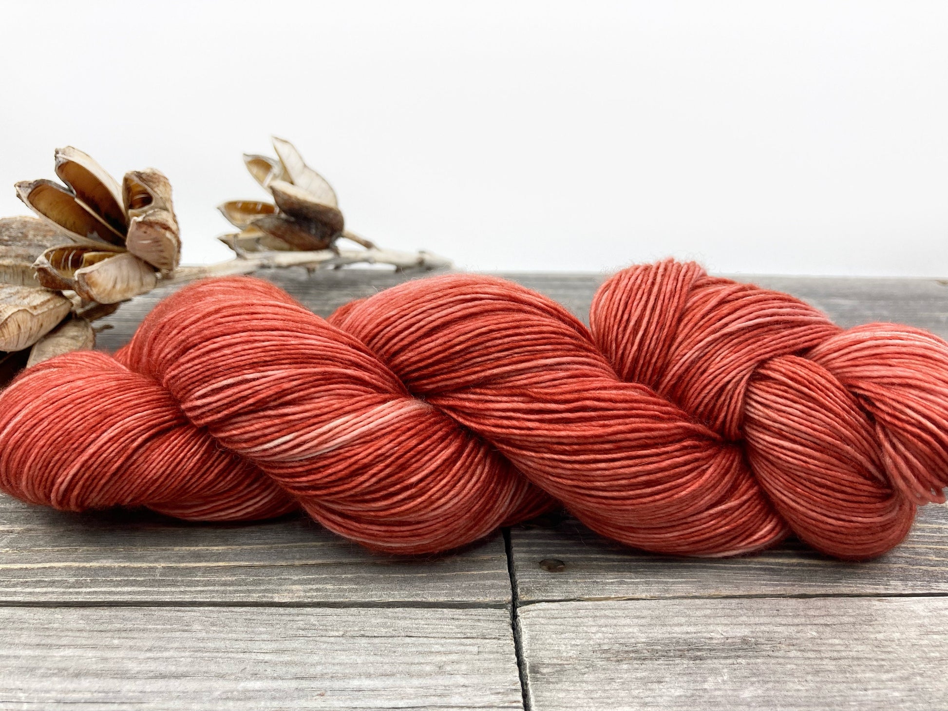 Super soft and washable single ply kettle dyed Merino yarn. The colorway contains shades of Red. This is a semi solid colorway with darker and lighter areas.