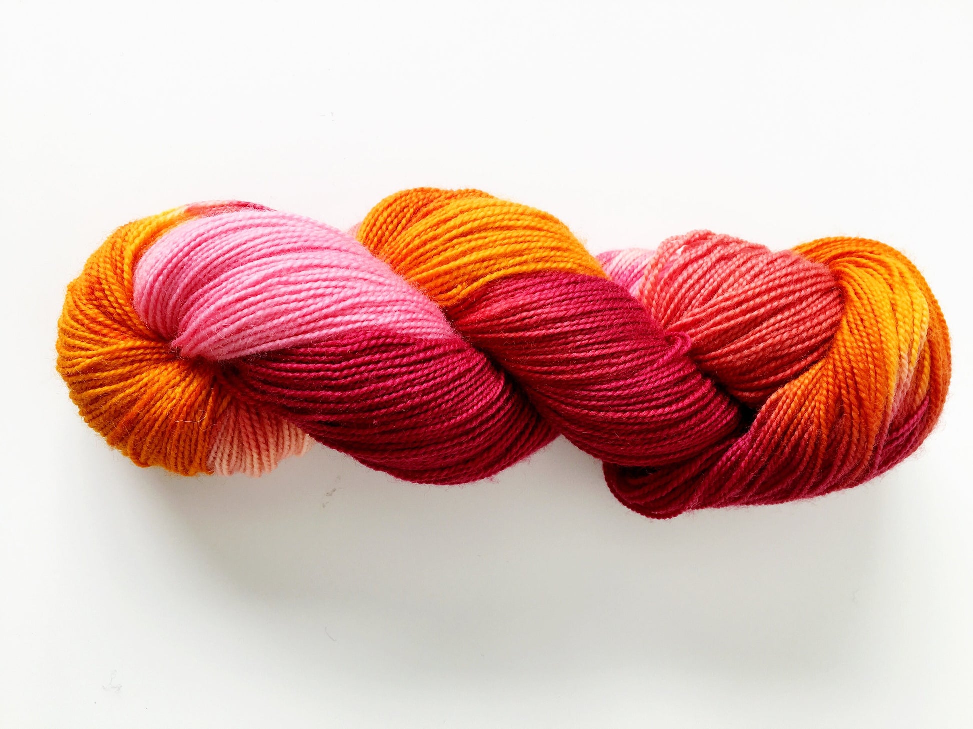 Super soft and washable. The colorway contains shades of rich pink and red mixed with orange.