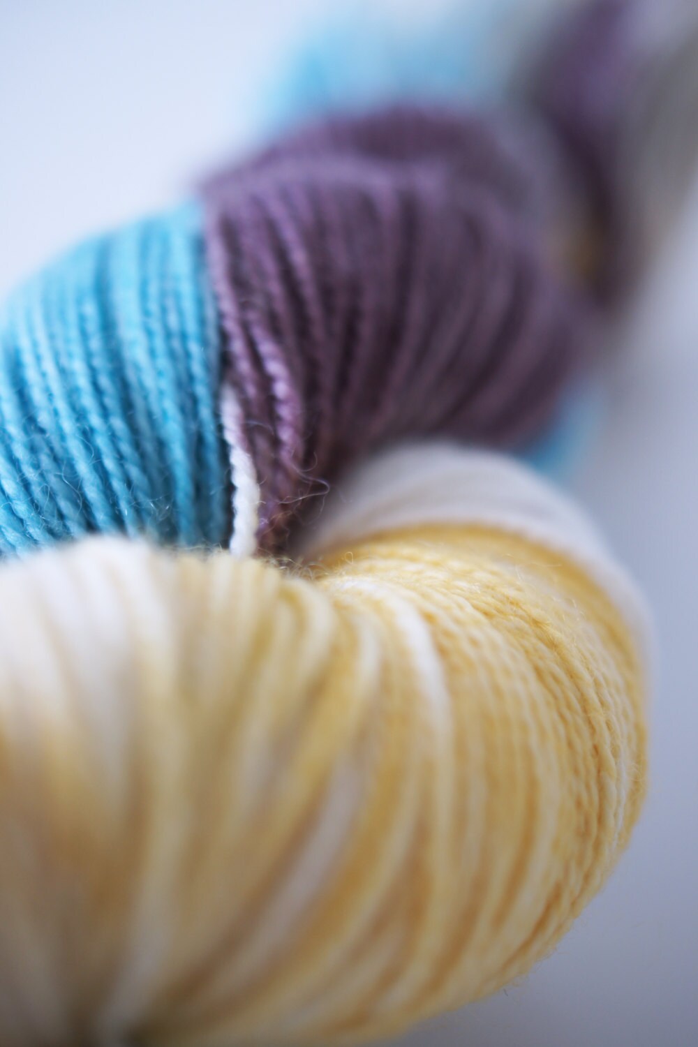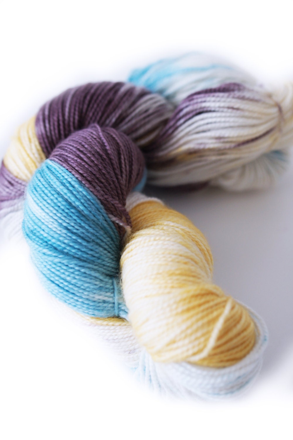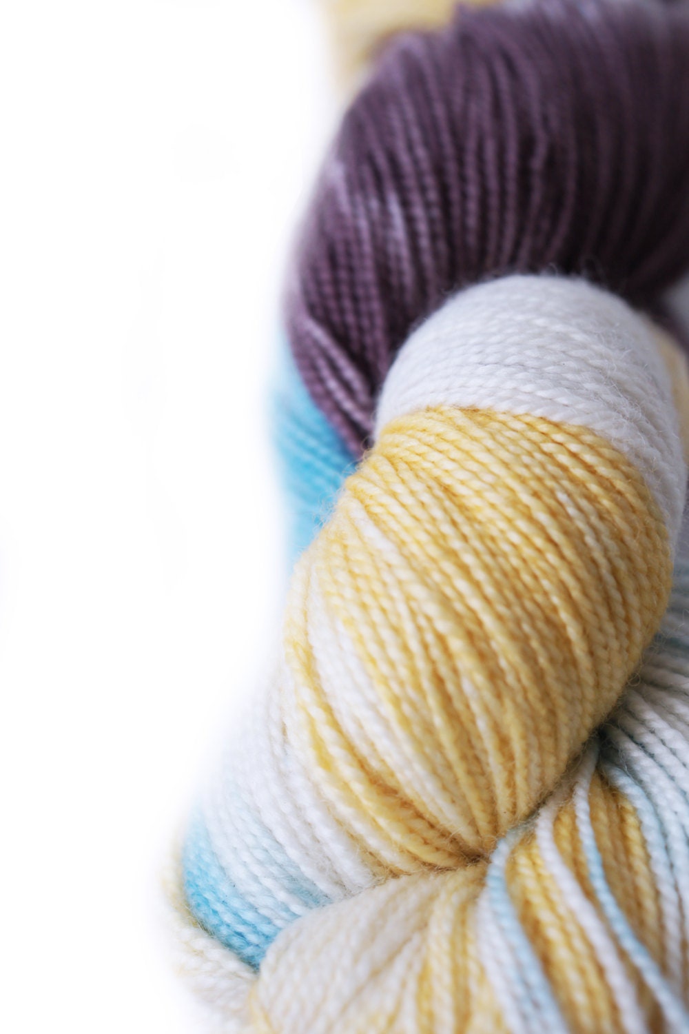 The colorway contains shades of rich yellow, aqua, purple and white. . . Lilac Dream • 100% Superwash Merino Wool • Fingering Weight • Approx. 440 yards | Approx. 100g • 6-8 sts = 1" (US 2-4)